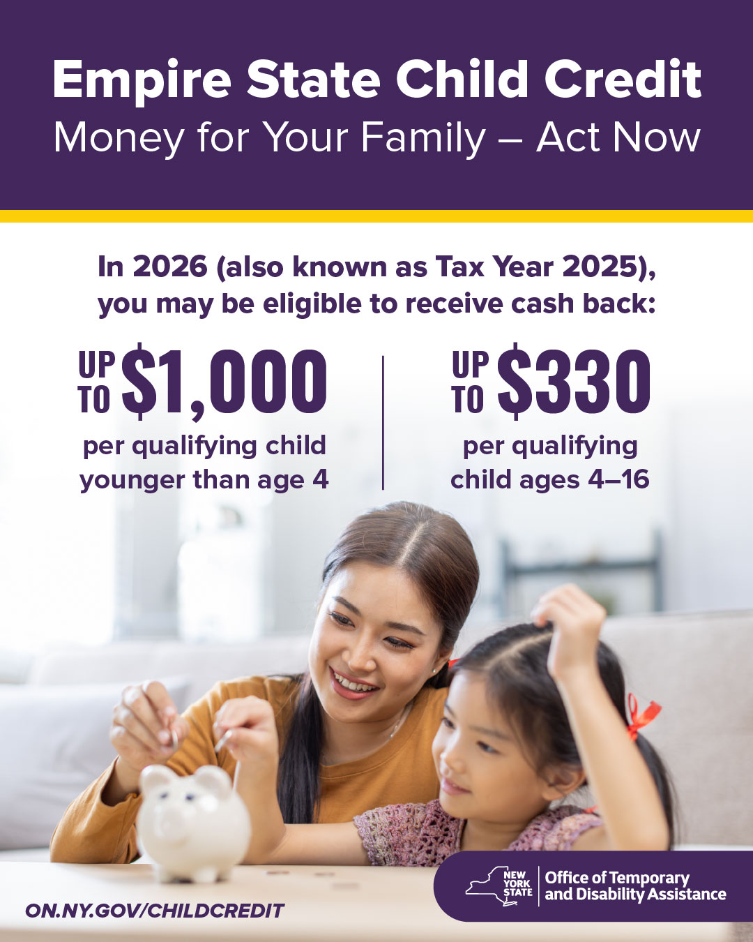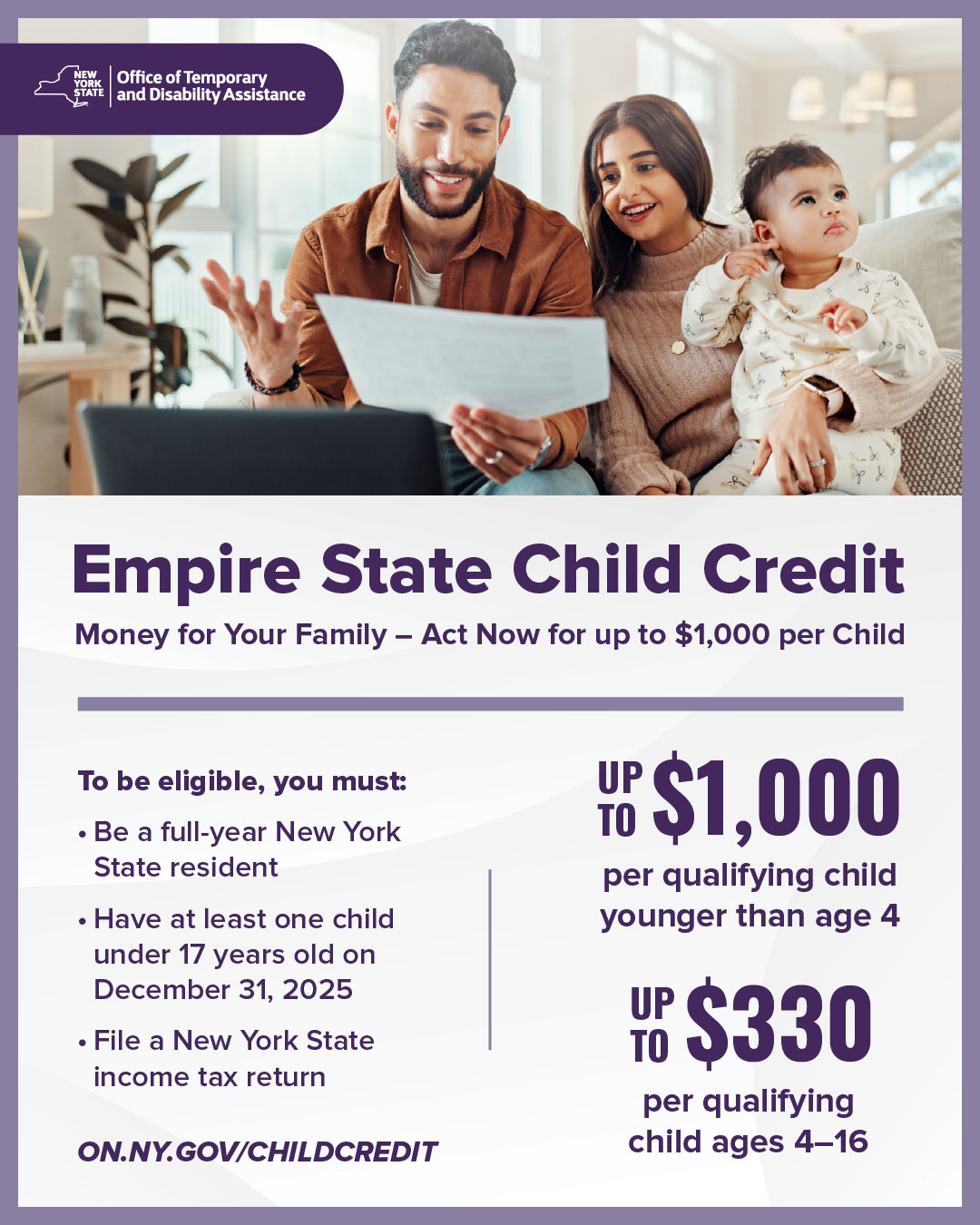 You may qualify for up to $1,000 per child with the Empire State Child Credit. Check your eligibility by visiting on.ny.gov/childcredit