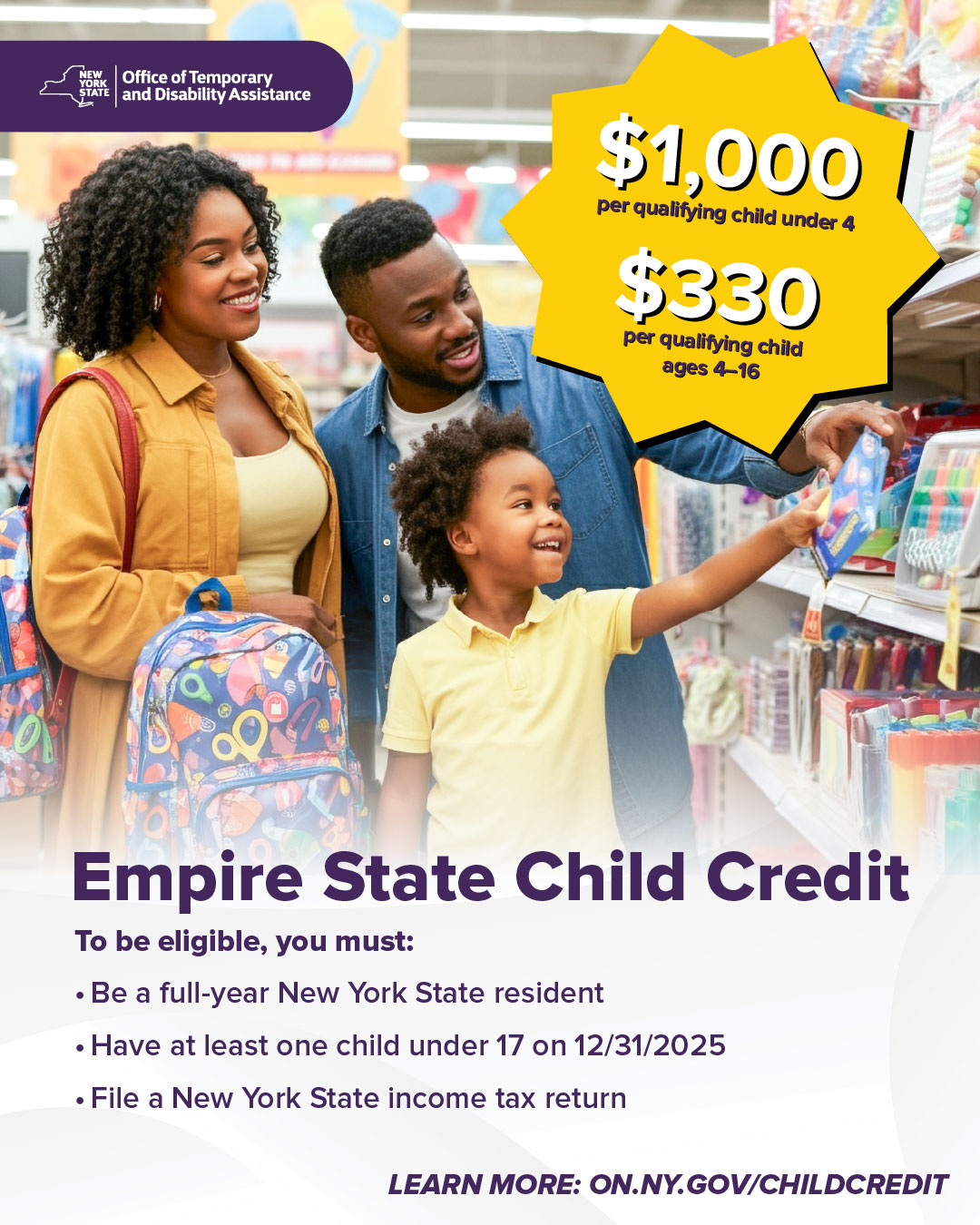 You may qualify for up to $1,000 per child with the Empire State Child Credit. Check your eligibility by visiting on.ny.gov/childcredit