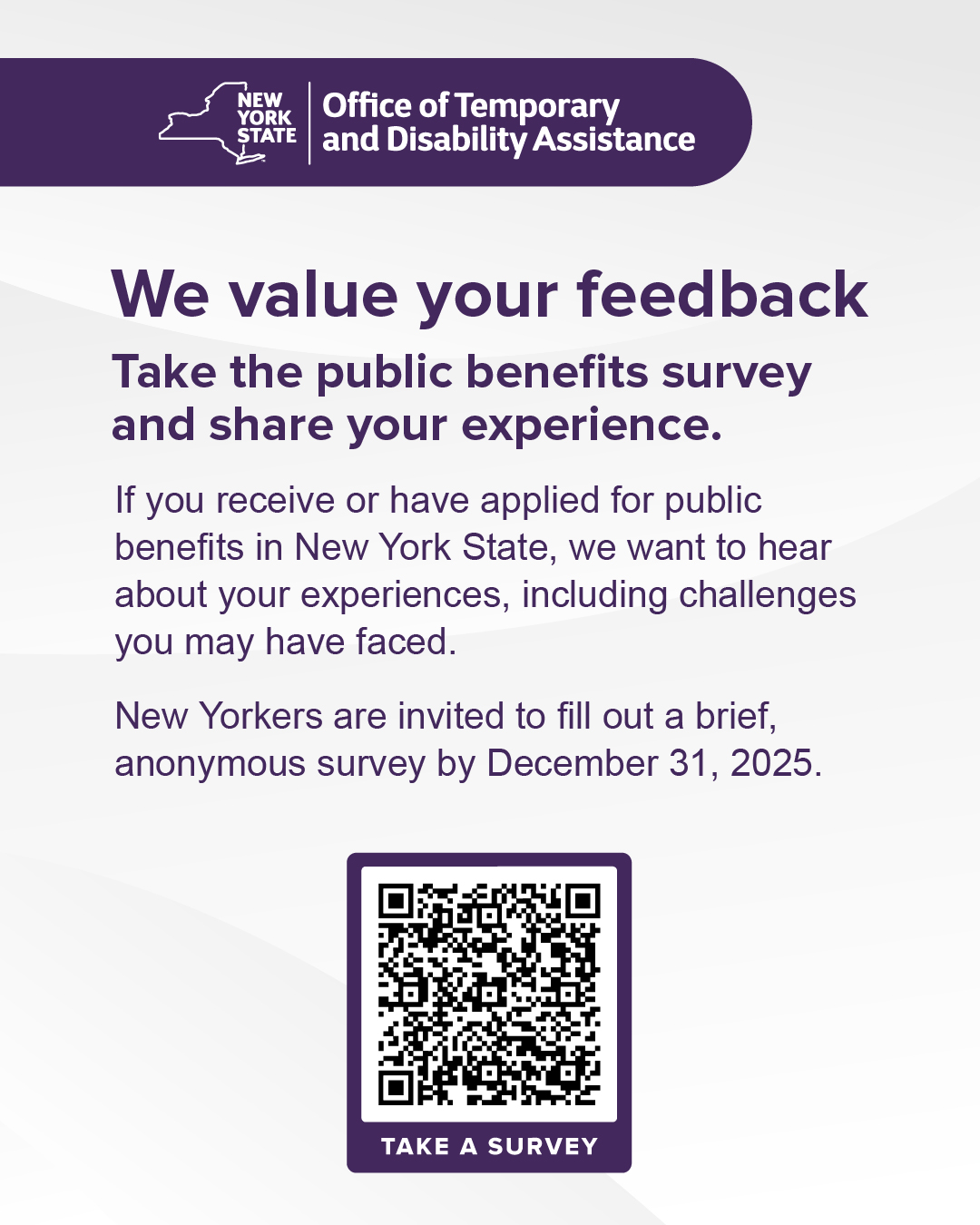 If you receive or have applied for SNAP, Public Assistance, or SSI from New York State, OTDA wants to hear your feedback. New Yorkers are invited to fill out a brief, anonymous survey by December 31, 2025. Scan the code or visit; https://forms.office.com/g/iXXyiDETtG